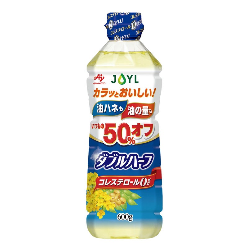 「AJINOMOTO ダブルハーフ」は、使用量が通常の2分の1で調理でき、油ハネが少ないコレステロール0 ( ゼロ ) のキャノーラ油です。通常の油に比べて衣の中の水分が早く抜け、1/2の油でカラッとおいしく揚がります。また、水となじみやすい油のため、油の中に分散する水滴が小さくなり、調理中の油ハネも通常の半分の量に抑えられます。使用量と油ハネを抑えることにより半分の量で、揚げもの、炒めものがあっさり仕上がります。油ハネが50%に減るので、後片付けがラクラク。(※当社キャノーラ油同容量帯と比較)手軽にたっぷり使える900gサイズもあります。