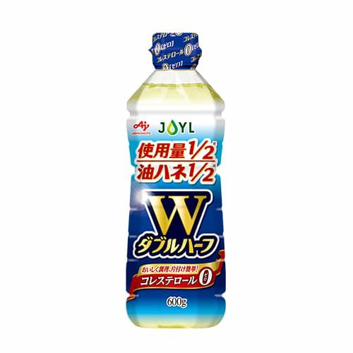 「AJINOMOTO ダブルハーフ」は、使用量が通常の2分の1で調理でき、油ハネが少ないコレステロール0 ( ゼロ ) のキャノーラ油です。通常の油に比べて衣の中の水分が早く抜け、1/2の油でカラッとおいしく揚がります。また、水となじみやすい油のため、油の中に分散する水滴が小さくなり、調理中の油ハネも通常の半分の量に抑えられます。使用量と油ハネを抑えることにより半分の量で、揚げもの、炒めものがあっさり仕上がります。油ハネが50%に減るので、後片付けがラクラク。(※当社キャノーラ油同容量帯と比較)手軽にたっぷり使える900gサイズもあります。