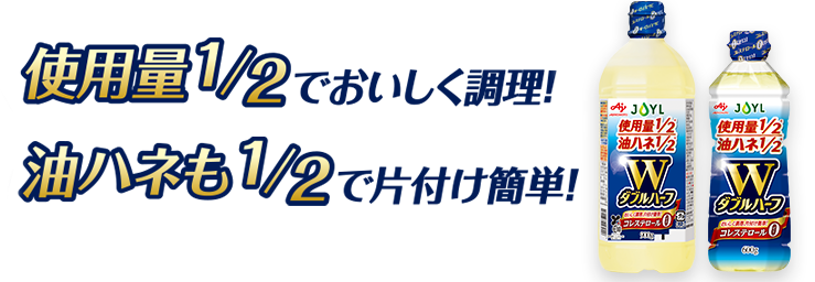 揚げものの衣ともなじみやすい油のため、通常の油に比べて衣の中の水分が早く抜け、1/2の油でもカラッとおいしく揚がります。 また1回の使用量が1/2になるため家計の負担を軽減します。※1 当社従来品との比較