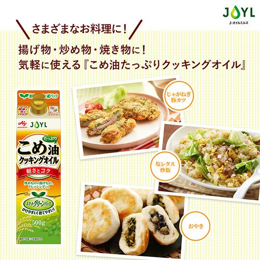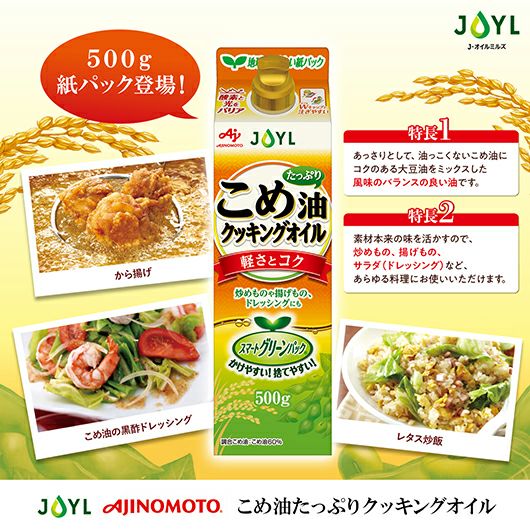 他の画像を見る こめ油がたっぷり入った、料理がおいしく仕上がる油です。 「AJINOMOTO こめ油たっぷりクッキングオイル」 500gスマートグリーンパック 価格 ¥ 590 税込 カートに入れる お気に入りに登録する