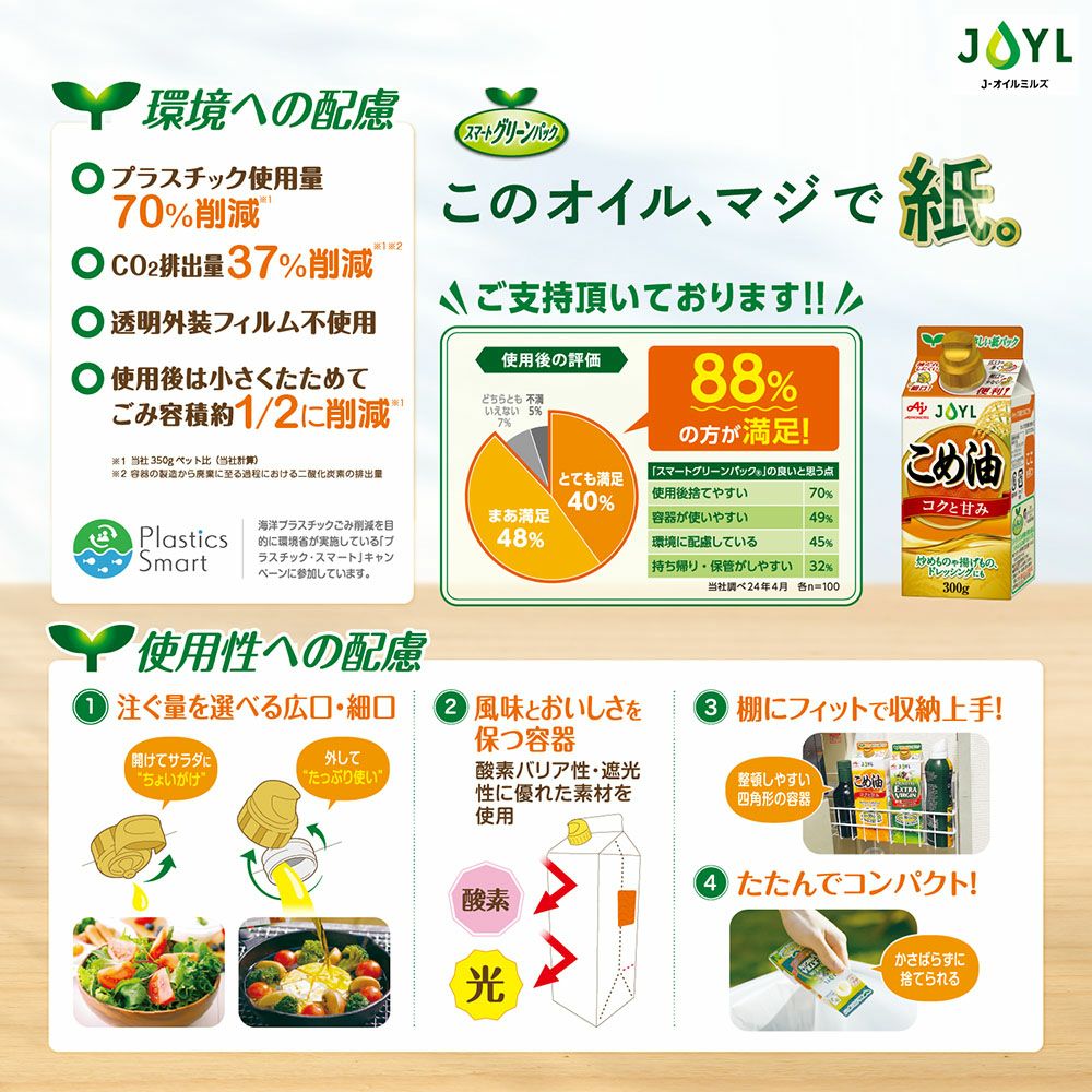 他の画像を見る クセがなく風味がやさしい、コレステロール0のオリーブオイル。 「AJINOMOTO やさしいオリーブオイル」 300gスマートグリーンパック 価格 ¥ 800 税込 カートに入れる お気に入りに登録する