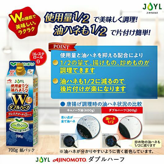 他の画像を見る 使用量1/2、油ハネ1/2でカラッと揚がる油です。 【OUTLET】「AJINOMOTO ダブルハーフ」 700gスマートグリーンパック 通常価格 ¥ 660 のところ 価格 ¥ 330 税込 販売期間 2026/03/04 13:00 〜 2026/03/09 23:59 カートに入れる お気に入りに登録する